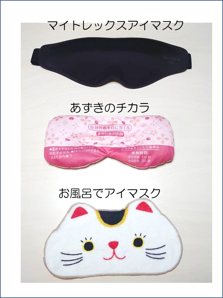 実際に私がしている方法を説明します。1回目は、昼食後の昼寝の際にします。電子レンジでチンする「あずきの力」とマジックテープで固定できるマイトレックスアイケアというアイマスクを使用します。あずきの力をレンジでチンしてから、まぶたに当ててその上からそのアイマスクをかぶせてマジックテープで固定するだけです。その状態で昼寝に入ります。これなら頭が動いてもずれませんし、昼寝と同時ですので特別な時間も必要ありません。あずきの力は電子レンジさえあれが何百回も使えますので、安価です。2回目はお風呂に入るときです。普通のハンドタオルでもよさそうですが、私は「ダイカットマスク、お風呂でアイマスク」というタオル地のアイマスクを使っています。湯船につかることが前提ですが、その際にお湯でひたしたタオル地のアイマスクをまぶたにのせます。固まった油を溶かす最適な温度はお風呂の湯温と同じくらいの40℃といわれていますので、温度が下がりはじめる20秒ごとくらいに、再び湯船のお湯で温めなおすことを5分間以上繰り返します。これも湯船につかるのと同時にできますので特別な時間も必要ありません。結構忙しいのであまりリラックスはできないかもしれません。