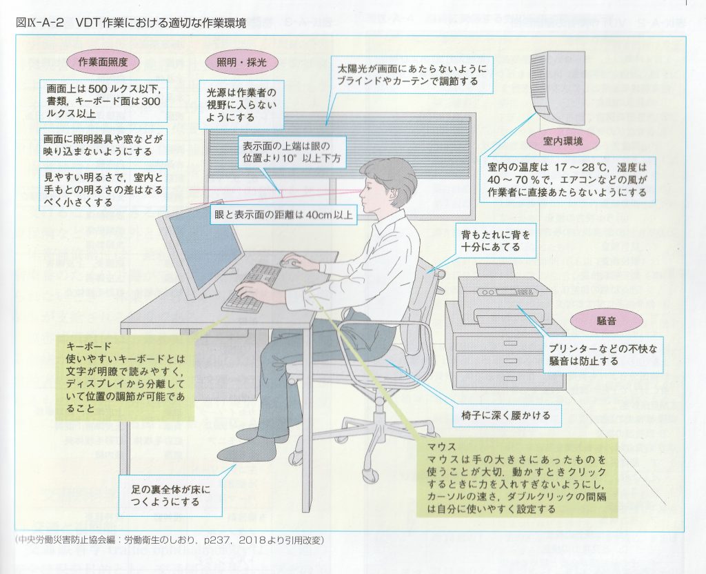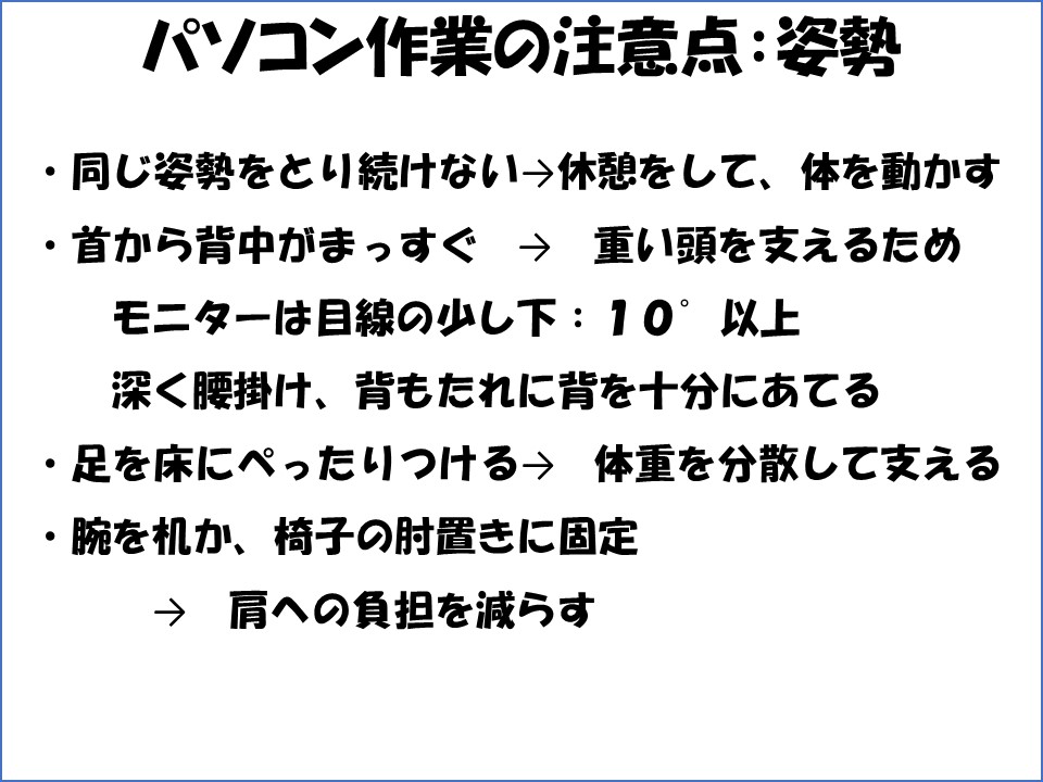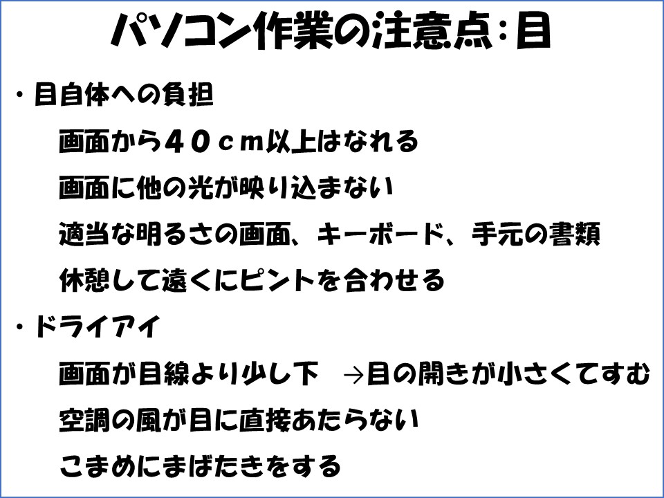 目については、一つ目に目自体への負担があります。画面から40cm以上の距離をとること、画面に他の光が映り込まないこと、画面、キーボード、手元の書類が適切な明るさであること、休憩をして他の距離(遠くが良い)にピントを合わせる時間をとることなど、お伝えしてきた通りです。