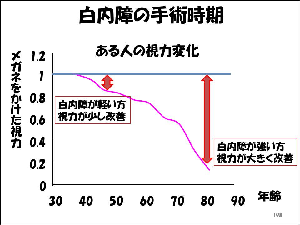 人の一生で白内障はゆっくり進行していきます。白内障が軽い時期に手術した場合、見え方はあまり良くはならないので喜ばれませんが、その後の一生をよく見える状態で過ごすことができます。それに対して、白内障が強くなるまで待って手術した方は、手術するまでの長年に渡り見えにくい状態を我慢し続けることになりますが、手術した後はものすごく良く見えるようになり、非常に喜ばれるということになります。どちらが良いでしょうか。そのどちらかというよりはその中間あたりが良いのではないでしょうか。