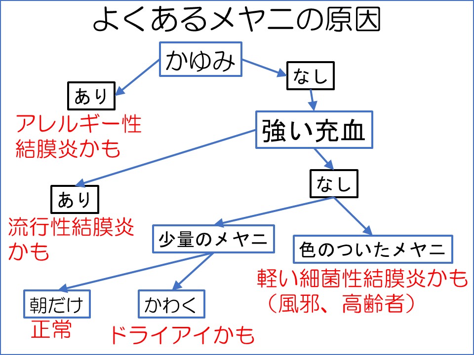 まず、目のかゆみがある場合は、アレルギー性結膜炎によるメヤニの可能性があります。かゆみがなく、強い充血がある場合は、流行性角結膜炎(人にうつるので学校は出席停止)の可能性があります。目が乾く場合は、ドライアイによるメヤニの可能性があります。ドライアイでは、1や2により生じたメヤニが洗い流されにくくなっているために、メヤニが増えたように感じられます。色のついたメヤニは軽い細菌性結膜炎の可能性があります。子供が風邪をひいて体調が悪い場合や、高齢者によく見かけられます。いつもよりメヤニが増えて、メヤニ以外の症状がある場合は、眼科を受診してください。