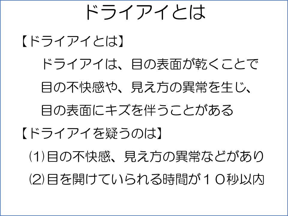 ドライアイについて説明します。まずドライアイとは直訳すると目の乾燥です。