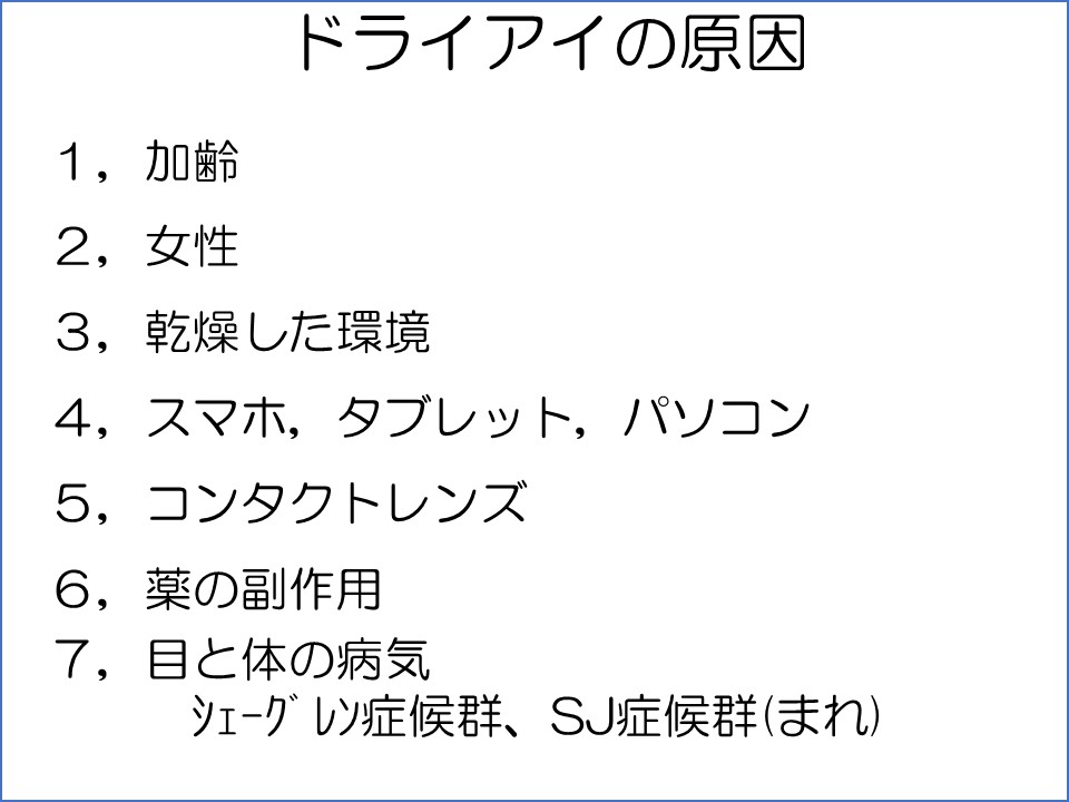 一つ目は、目薬をさしている間は調子がいいが、目薬を止めてしまうとまた症状がぶり返すという意味です。その意味では残念ながらドライアイは完全に治すことはできません。ドライアイの原因は、加齢、女性、乾燥した環境、スマホ・タブレット・パソコン作業、コンタクトレンズ、薬の副作用、目と体の病気などがありますが、自分でコントロールできないことの方が多いのがおわかりと思います。実際にはドライアイは涙自体が減ること、目の表面の油分がへることで涙が乾きやすくなること、涙が目の表面にとどまりにくくなること(水濡れ性)の三つが直接の原因と考えられています。これらのことを根本的に治すことはできず、不足している成分を補うための目薬などをさし続けた場合にのみ、症状をおさえることができるのです。