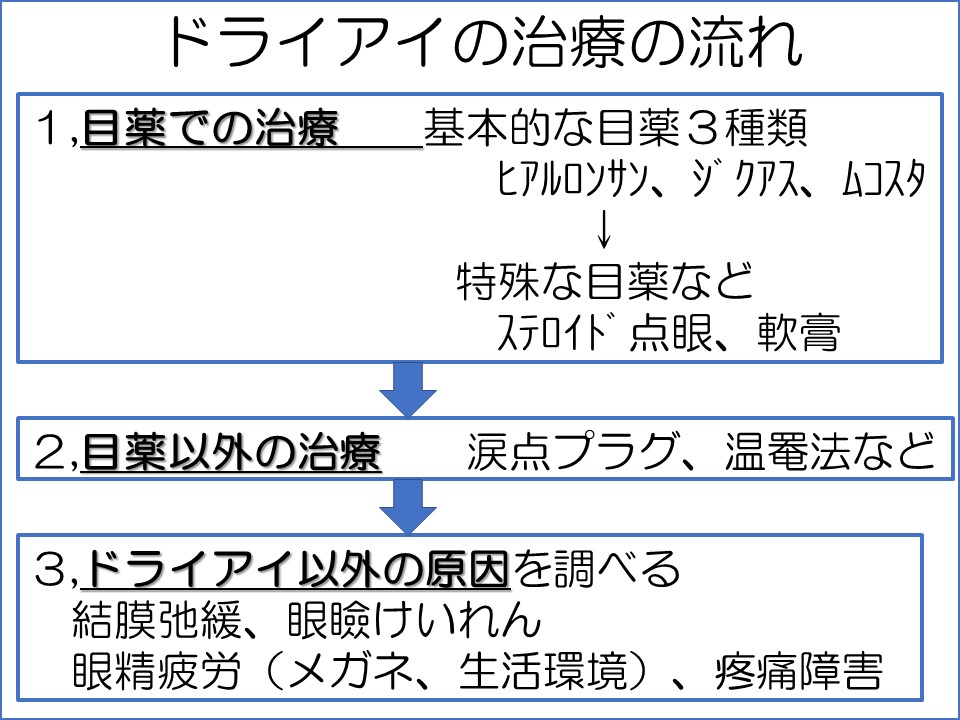 二つ目は、目薬などの治療をしても、症状が良くならないという意味です。前のブログ「ドライアイの症状は何でもあり?」で説明したように、目の症状の多くはとりあえずドライアイの診断に合うことが多いので、はじめはドライアイの治療を段階的にすすめていきます。まず最も効果が高く簡単な治療が目薬による治療で、現在よく効く目薬が主に3種類あります。その中の一つのヒアルロンサンは市販薬でも手に入れることができるようになりましたが、この3種類は患者さんによってかなり相性が違うので、3種類を別々に1か月ごとくらい試してみる必要があります。それでも効果がなければ、さらに別の目薬や軟膏を試してみます。それでも効果がなければ、涙の出る量を調べ、涙がほとんど出ていなければ「涙点プラグ」を入れる処置をするという流れになります。それでも効果がなければ、ドライアイ以外の原因を詳しく調べることになります。こちらについては別のブログでお伝えします。