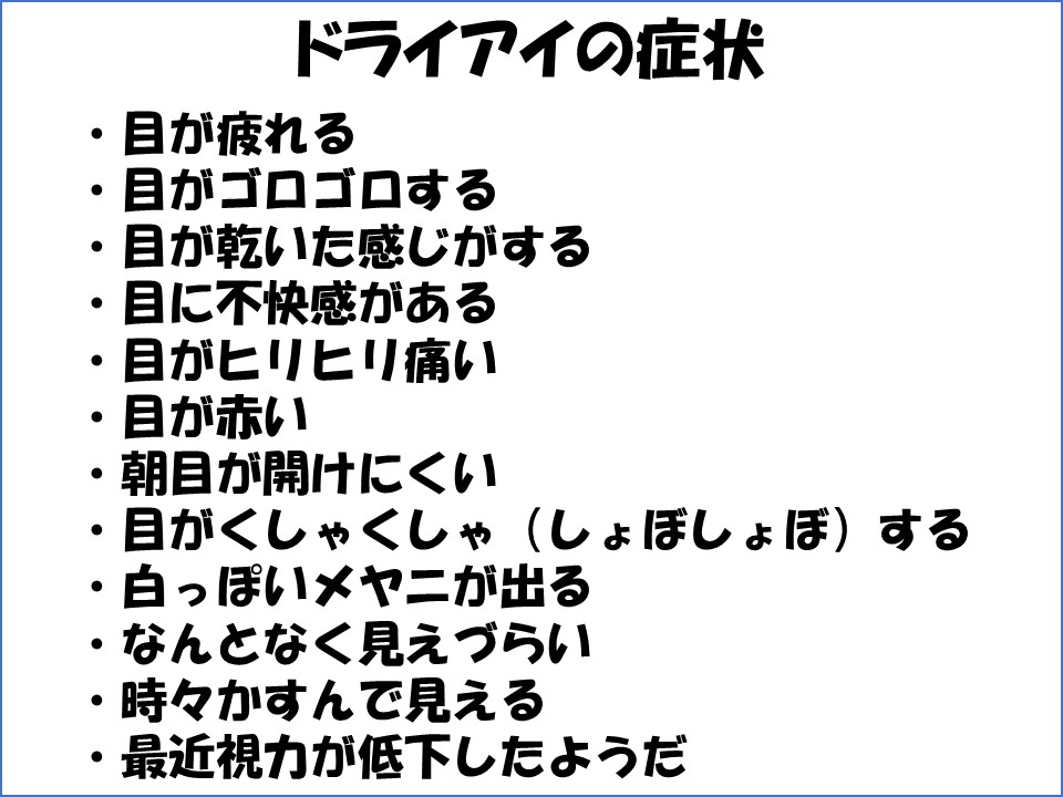 最も多い原因はドライアイです。ドライアイは日本人の5人に1人、オフィスワーカーの3人に1人にあるとも言われています。症状も多彩で、目の症状であればどんなものでもドライアイに当てはまってしまいそうです。実際、頭痛や肩こりなどがドライアイから起こるかどうかは分かりませんが、疲れ目、目の痛み、目の奥の痛みなどはドライアイが原因のことが多いと普段の外来で感じています。