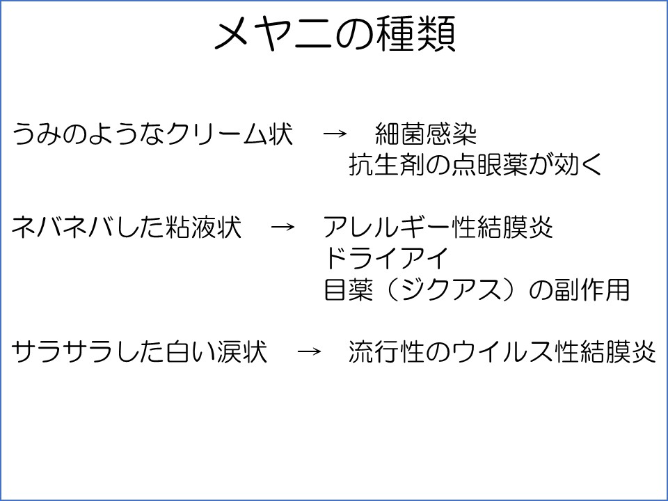 メヤニの状態により原因を推測することができますので、説明します。まずメヤニ自体は誰でも少しは出て、他の症状がなければ心配いりません。メヤニの量が多い場合の大まかな種類には、膿性(膿:うみのようなクリーム状)と粘液性(ネバネバした粘液状)、水様性(水のようにサラサラ、白っぽい)があります。