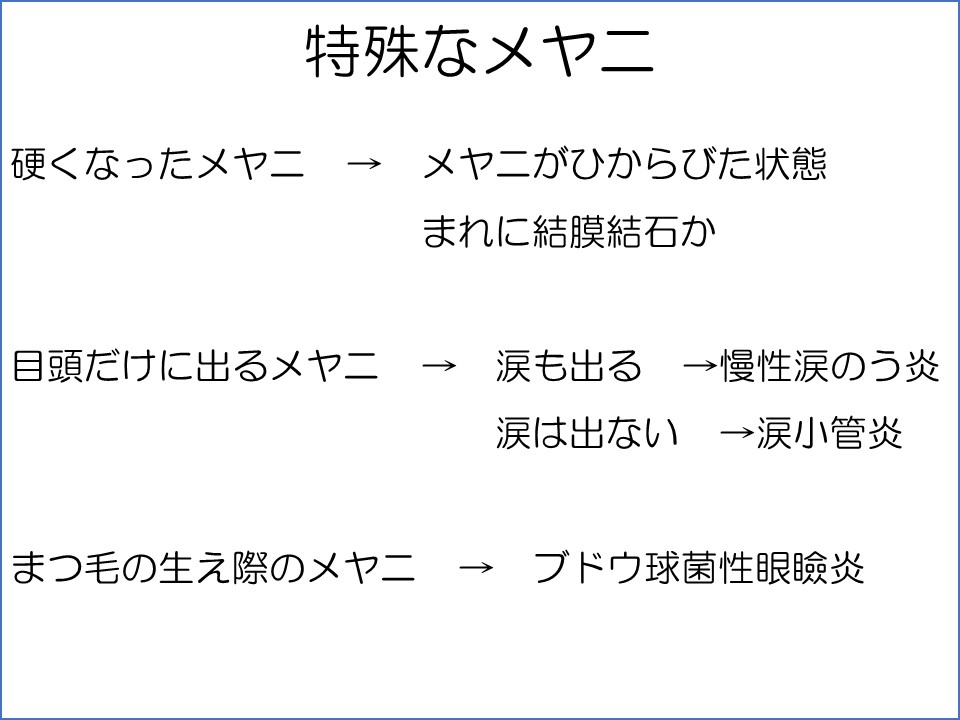 次に、特殊なメヤニについて説明します。よく患者さんに硬いメヤニが出たと言われることがあります。これはほとんどの場合、目頭や目尻についたメヤニが時間と共にひからびた状態ですので、心配いりません。まれに結膜結石(まぶたの裏にできるタンパク質の変性)が結膜から外れる場合もあると思いますが、今まで確認できたことは一度もありません。