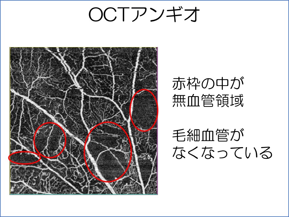 三つ目は、OCT血管撮影という新たに搭載された機能です。従来眼底の血管撮影は、造影剤を手の血管から注射して、撮影していました。造影剤によるショックなどの合併症がまれに起こるため、総合病院でしかできない検査となっていました。OCT血管撮影では、造影剤を使うことなく、造影検査に近い検査結果を得ることができるようになりました。詳しい原理はここでは省略しますが、血液中の赤血球の動きをとらえることで、網膜の血管の撮影ができるとのことです。現状では造影検査に完全にとって変わるものではありませんが、糖尿病網膜症や網膜静脈閉塞症などに威力を発揮します。特に糖尿病網膜症では、無血管(血流がない)領域の有無を見つけることがとても重要ですが、通常の眼底検査だけでは判別しづらく、見落としてしまうことも正直ありました。この新しい機能で、合併症のリスクを負うことなく、検査ができるようになりました。