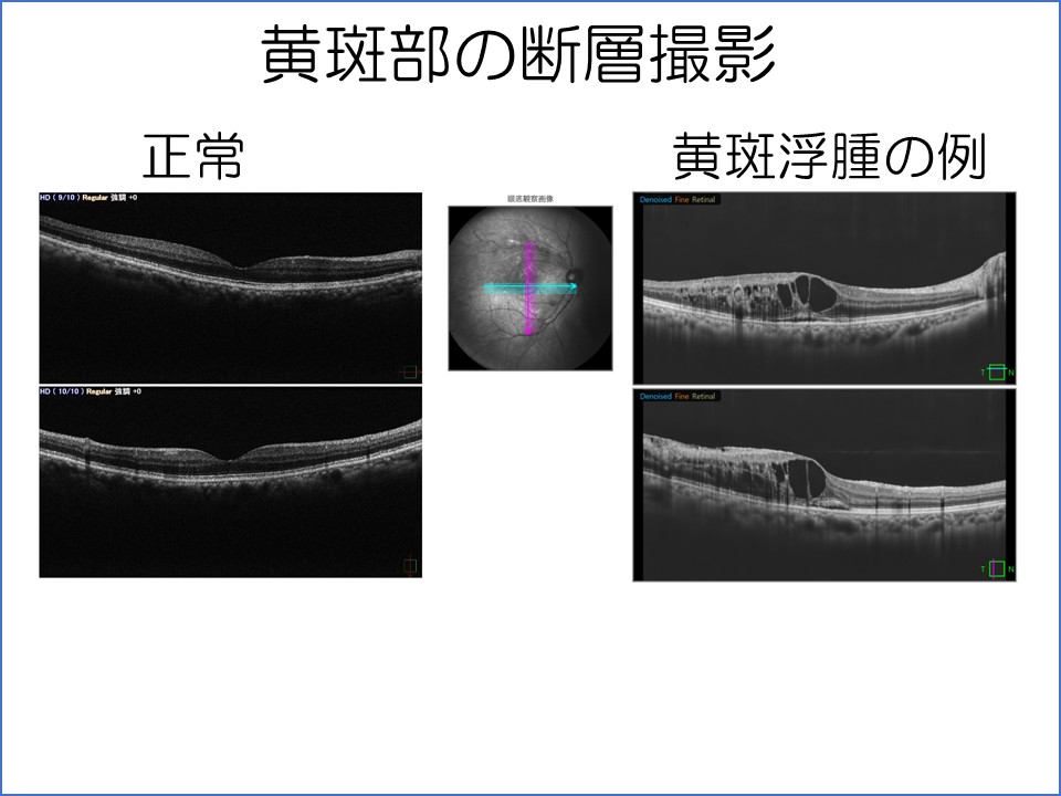 一つ目は、網膜(フイルム)の中心である黄斑部の断層撮影をすることです。黄斑の病気には、黄斑上膜、黄斑変性、黄斑浮腫、黄斑牽引など多数の病気があり、視力に直結します。顕微鏡で直接診察してもとらえることのできない断層画像をもとに、黄斑の病気の治療方針や治療効果の判定を行います。