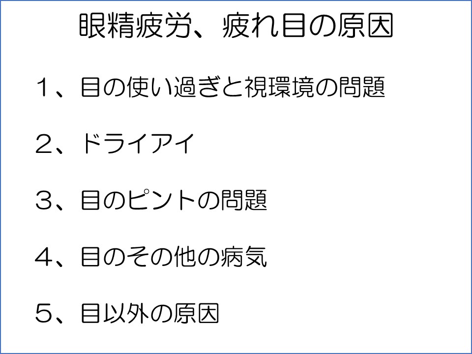 眼精疲労とは目を持続的に使ったことによる疲労や不快感、目の重圧感、頭痛、肩こり、気分不良、目のかすみを訴えることとされています。原因は様々で、以下のようなものがあります。