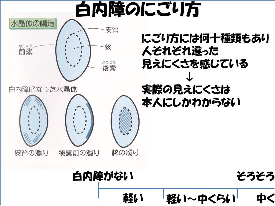 白内障のにごり方は人の顔のように個性があり、患者さんがどのように見えているかは、実は医師からもわかりません。よく患者さんに白内障の程度は10段階でどれくらいですか?と聞かれることがありますが、数字で表すのは難しいです。