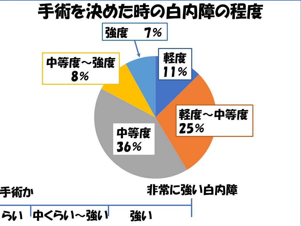 当院では、そろそろ白内障手術をしてもいいかなという時期の白内障のにごりを「中くらい」として、患者さんに白内障のにごりの程度をお伝えしています。主観が入りますが、「軽い」「軽い~中くらい」「中くらい」「中くらい~強い」「強い」の5段階にしています。実際に統計を取ってみると、「中くらい」で手術することが最も多く、次が「軽い~中くらい」となっており、「軽い」と「強い」でも手術をされている方もおられます。 この白内障のにごり方の視標を患者さんにお話しして、手術を決める際に参考にしていただいています。