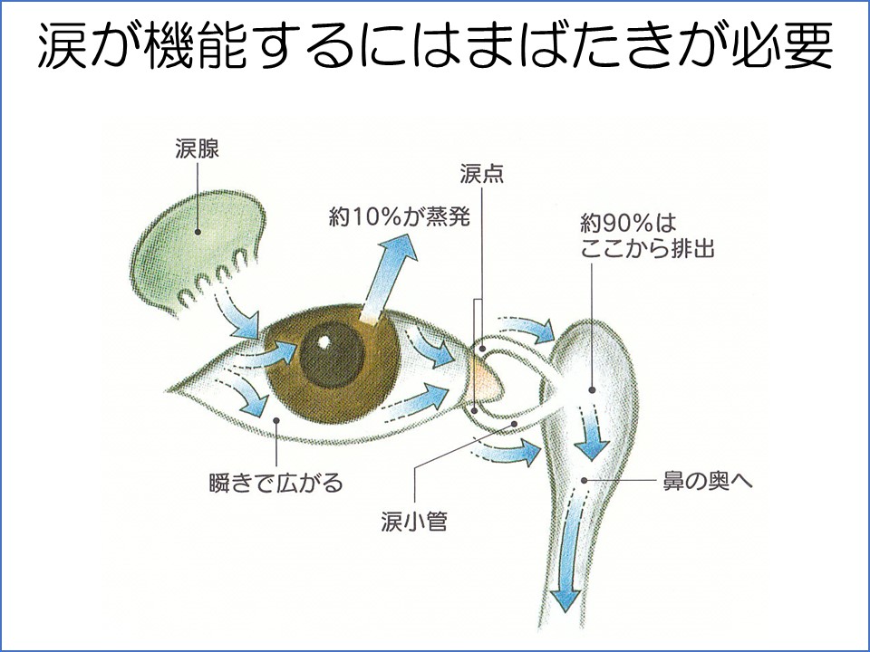 まず、目の表面には血管がなく、まばたきをすることで、涙が目の表面に行き渡り、涙から栄養をもらったり、涙により異物や老廃物などが洗い流されています。