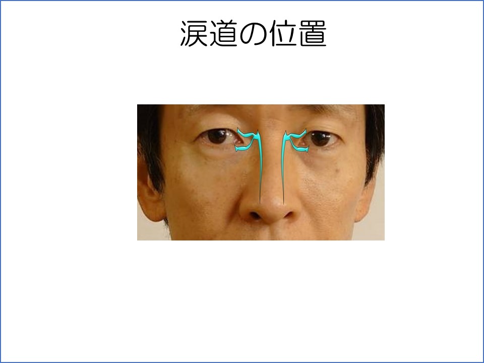涙道の閉塞が疑われたら、次は涙管通水検査です。目頭(目の内側の端)のまぶたの際に涙点という小さな穴があり、その穴に先がとがっていない注射針のようなものを入れて、水を流します。水が鼻に流れこめば、涙道の閉塞はないと診断できます。残念ながら、この検査は目薬の麻酔はしますが、若干(人により激しい)痛みを伴います。この検査で涙道のどの部位がつまっているのかが大体わかり、治療方針を立てることができます。
