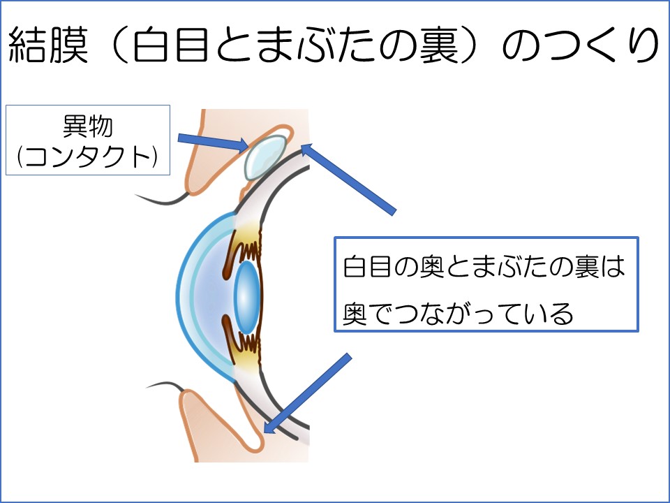 まず目の表面の結膜(白目)は奥に行くとまぶたの裏とつながっているので、奥に入って取れなくなるということはありません。しかし、下まぶたは自分でアカンべーをすると白目とまぶたの裏の境まで見えますが、上まぶたはまぶたを完全に裏返さないとその境まで見えません。これは練習しないとできませんので、ご自分では難しいと思われます。しかも1回ひっくり返しただけではまぶたと白目の境が見えない場合も多いので、さらにもう1回ひっくり返すのはさらに難しいです。コンタクトは透明ですのでそのままでは見えづらく、特に破れたソフトコンタクトはくしゃくしゃになってるので見つけるのが難しいです。眼科では特殊な色素(フルオレセイン)をつけて特殊な光をあてることで見つけることができます。