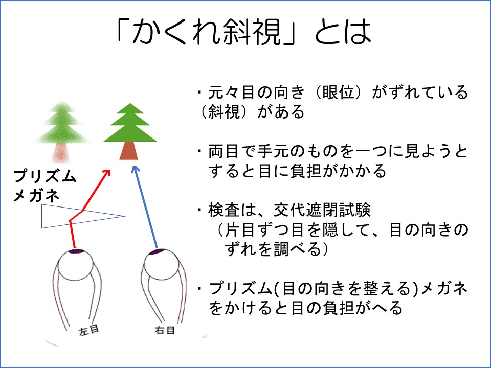 ものが二重にみえる症状は、眼精疲労から、ウロウロする、変な感じに見える、気分が悪い、揺れて見えるなど患者さん自身も何と表現したらいいかわからない場合があり、その症状が斜視からとすぐにはわからないことも多いのです。
