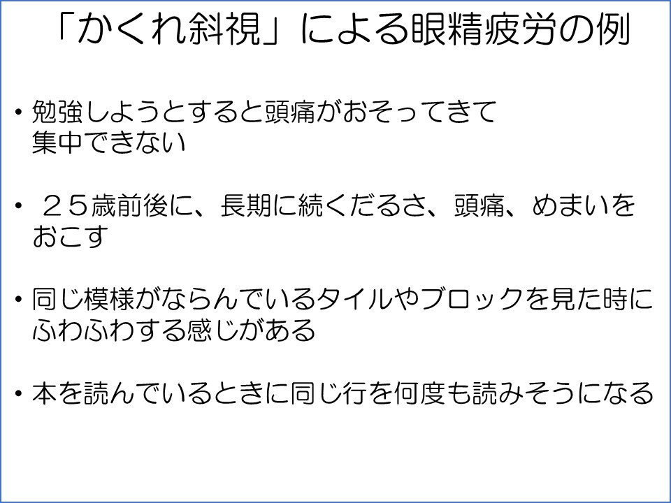 よくある例は、勉強しようとすると頭痛がおそってきて集中できない、25歳前後に長期にわたるだるさ、頭痛、めまいなどをおこす、同じ模様が並んでいるタイルやブロックを見た時にふわふわする、本を読んでいるときに同じ行を何度も読みそうになるなどがあります。