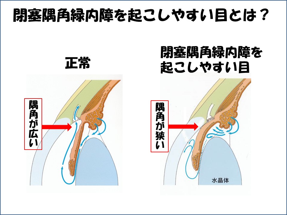 閉塞隅角緑内障を起こしやすい人は、元々目が良かった方に多く、隅角が狭くなっているという特徴があります。