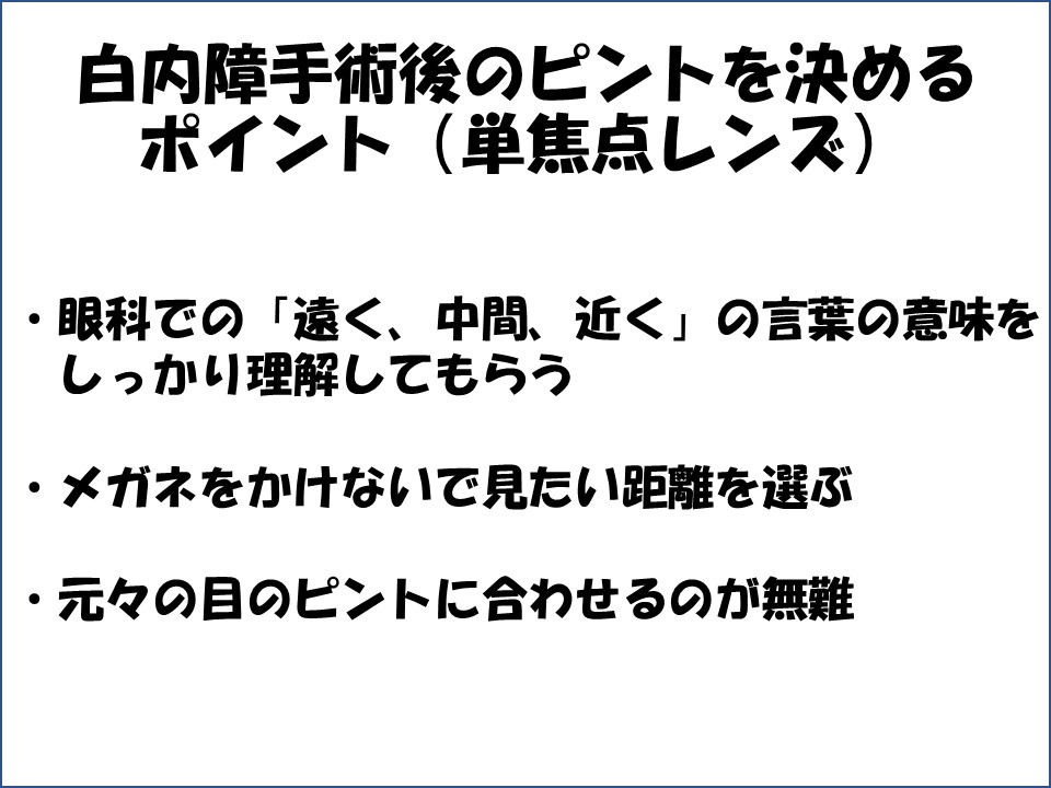 三つ目は、手術後も、元々の目のピントに近い状態に合わせるのが無難で、生活しやすいと考えられることです。目が良かった方は、遠くにピントを合わせ、近くは老眼鏡をかけてもらい、元々近視の方は、メガネを外して手元を見る習慣があるので、近くに合わせることで、手術後の見え方にすんなり馴染まれる方が多いようです。