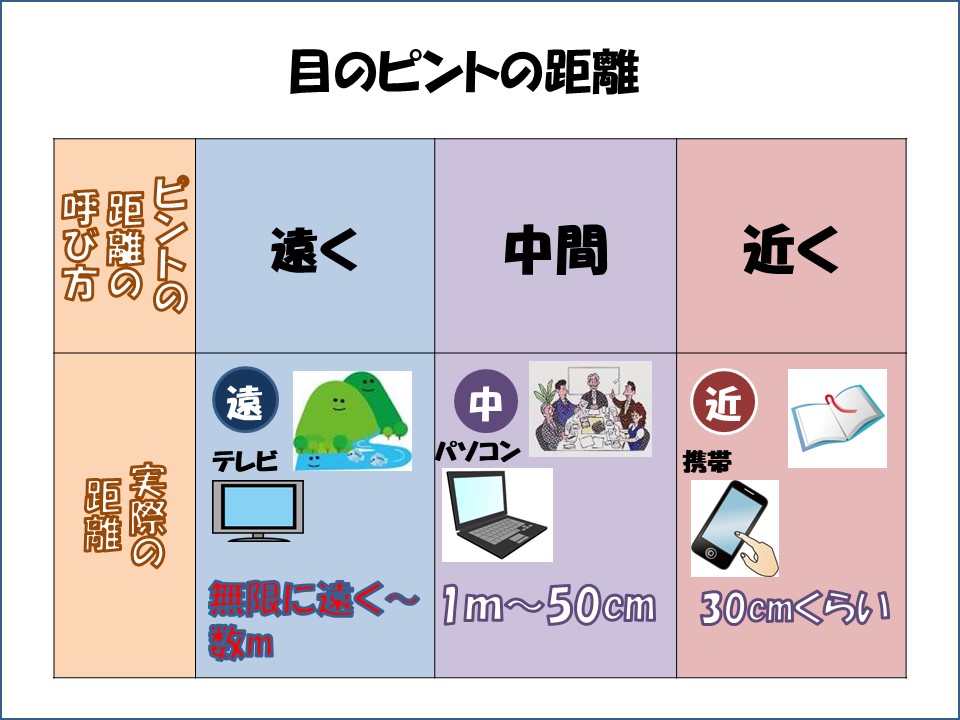一つ目は、眼科での「遠く、中間、近く」という言葉の意味を正しく理解してもらうことです。患者さんによっては、言葉のイメージとして、遠くは遠くの山の景色、近くはテレビなどと誤解される場合がありますので、まずその誤解を解かなければなりません。眼科で遠くとは、数メートル先から無限に遠くまでを含みます。中間とは1メートルから50センチメートルくらいです。近くとは、手元の字を見るキョリです。