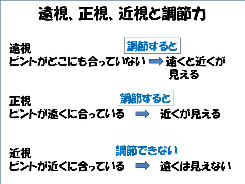 目のピントの「調節力」は、自分の目の形で決まっているピントの距離よりも、近くだけにピントを合わせることができます。その働きにより元々遠くが見える正視の方は近くまで、元々どこにもピントが合っていない遠視の方は遠くから近くまでピントを合わせることができるのです。それに対して近視の方は、遠くにはピントを合わせることができず、遠くはメガネがないと見えないということになります。
