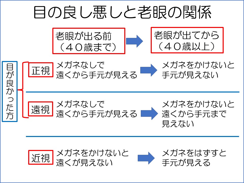 老眼による調節力の低下は、個人差が少なく、年齢により大体同じように進行します。しかし、目が良かった方、特に遠視の方は、より若い年齢で、しかも遠くもメガネが必要になりますので,見かけ上、老眼が早く進んだように見えるのです。しかも年を取ってからのメガネは慣れにくく、元々自分は目がいいと思っていたのにというショックも大きく、苦労されることが多いようです。