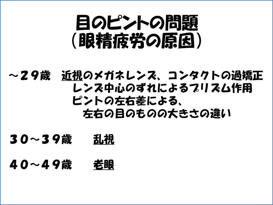 目のピントの問題は、年代別に主な原因が変わります。30歳未満の若い世代では、近視のメガネ・コンタクトの過矯正、レンズ中心のずれによる斜視といった、メガネ・コンタクトの不適切な処方が原因となることが多いです。また、ピントの左右差が大きい場合にメガネで矯正すると、左右でのものの大きさが違ってしまう(不等像視)も原因となります。30~39歳に多い問題は、乱視です。乱視には軸(乱視が強い角度と弱い角度)があり、この年齢くらいからその角度がかわっていくので、慣れないために眼精疲労の原因となります。40~49歳までは老眼です。40歳くらいから老眼を自覚する方が増え、60歳くらいで完全な老眼(調節力がほとんどない状態)になります。50歳以降では老眼による眼精疲労はかなり減るので、老眼に慣れたり、老眼鏡で対応したりしているのだろうと考えられます。老眼は逆らっても良くなることはないので、素直に受け入れる方が良いようです。