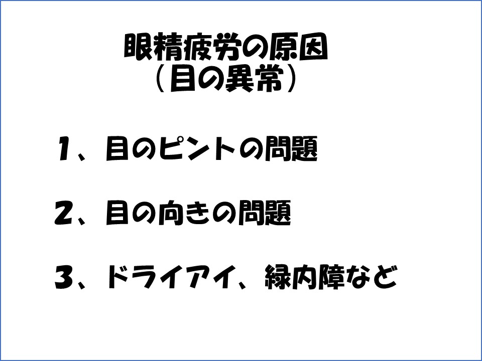 目が原因の眼精疲労(疲れ目、目の奥の痛み、頭痛、首のこり、肩こり)には、主に目のピントの問題、目の向きの問題、それ以外の目の病気(ドライアイ、緑内障など)があります。
