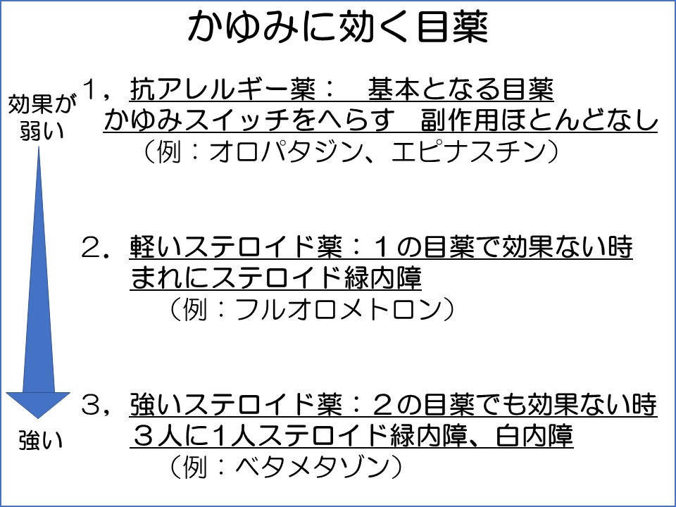 さらに弱いステロイド薬をさしてもかゆみが取れない場合には,さらに効果の強いステロイド薬があります。これはよく効きますが,続けて使うと高い割合で眼圧が上がって緑内障になったり,白内障になったりすることがあるので注意が必要です。