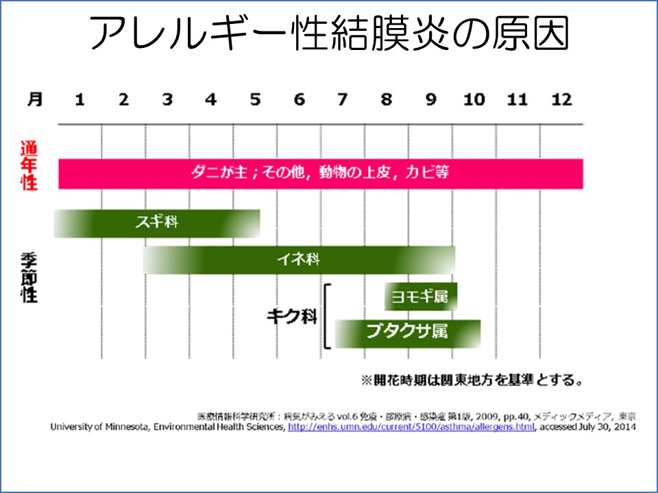 まず対症療法の抗アレルギー薬、ステロイド薬は、アレルギー物質を浴び続けている間は、薬を止めてしまえばまたかゆみの症状が出てしまいます。アレルギー物質には一年中あるもの(ダニ、イヌやネコの上皮、カビなど、ちなみにハウスダストアレルギーのほとんどはダニが原因)と、季節性(花粉症など)がありますので、アレルギー物質を浴びている期間は薬を使用し続ける必要があります。ただし、アレルギーによる目のかゆみは、目をこすることでさらに悪循環を起こしてかゆみなどの症状を悪化させてしまいますので、目薬で一旦症状をリセット(完全におさえる)することができれば、治療しやすい状態になります。