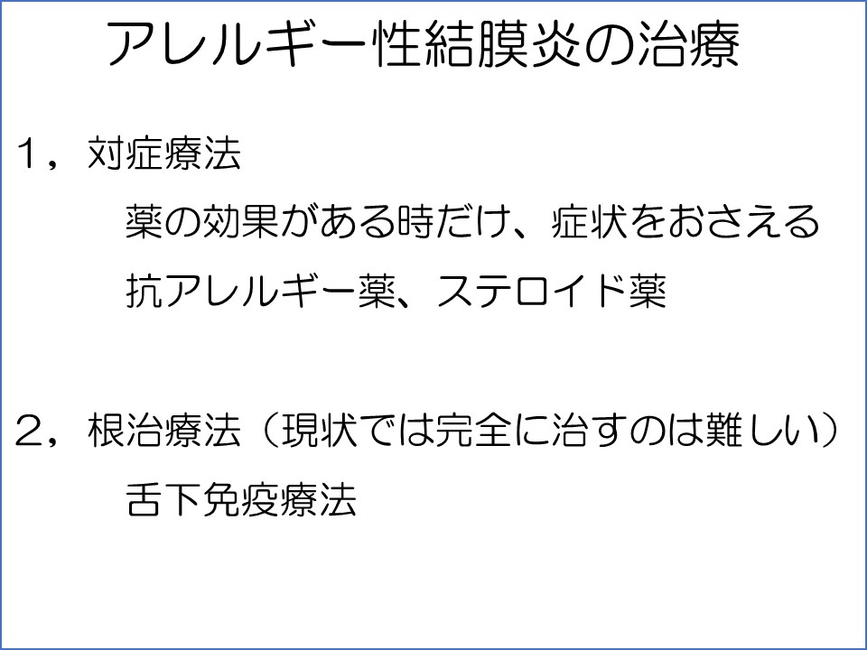 目薬をやめたらまたかゆくなったと言われることがありますので、説明します。アレルギーの治療には、前のブログでお伝えした抗アレルギー薬、ステロイド薬などのさしている時だけかゆみをへらす「対症療法」と、根本的にアレルギーを治してしまう「根治療法」の二つがあります。