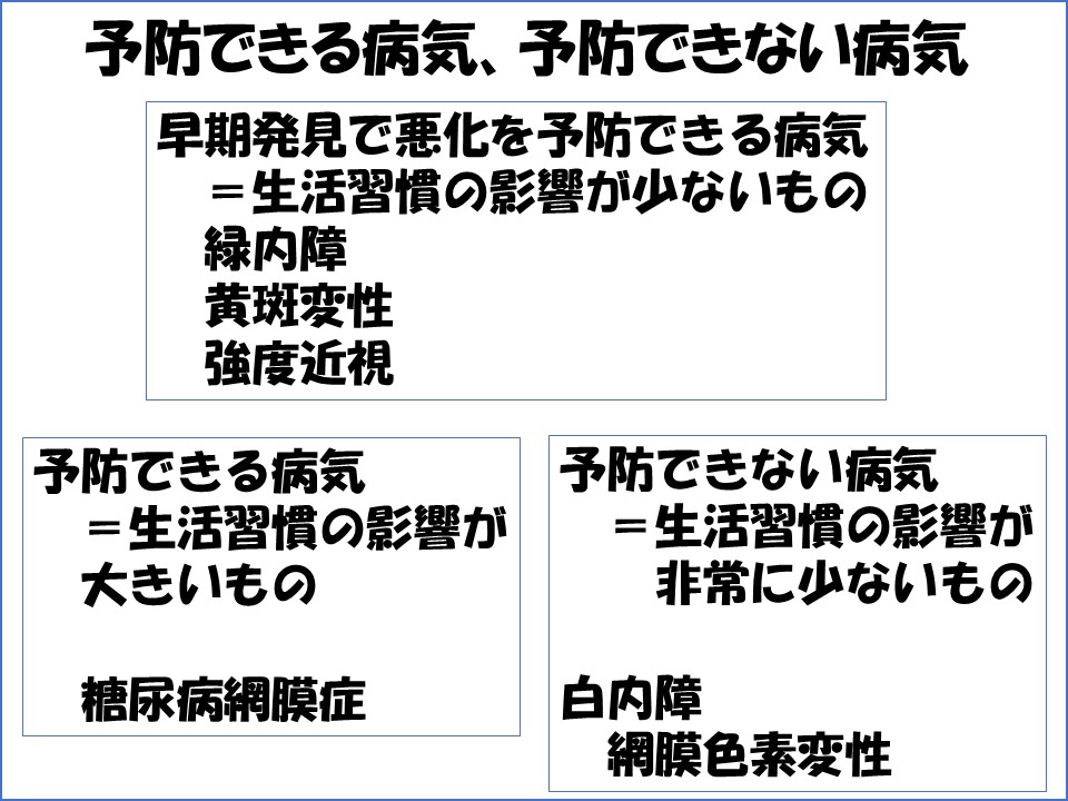 目以外の体の病気は生活習慣病といわれる、生活を改善することで予防できる病気が多いことがわかっていますので、患者さんのお気持ちはわかります。しかし残念ながら、目の病気については生活習慣が大きく関与しているものは少なく、加齢と体質に関係しているものが多いのが実情です。