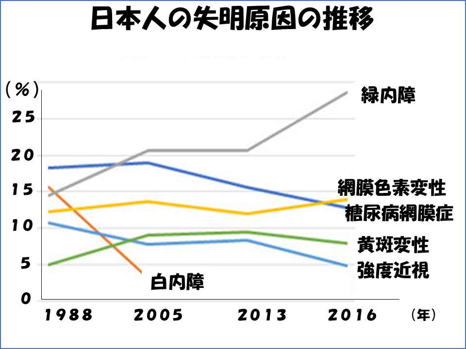 そこで、日本人の失明原因の推移をみていただくと、最新のデータでは、1位緑内障、2位網膜色素変性、3位糖尿病網膜症、4位黄斑変性、5位強度近視となっています。病気の発生には生活習慣、体質(遺伝も含む)、加齢の3つの条件が重要ですが、生活習慣の関与の割合によって、3つにわけられます。まず、生活習慣の関与が大きい病気は、糖尿病網膜症です。これは予防することができます。ただし、無症状で経過するので、自覚症状が出た時では手遅れになっている場合があります。次に、生活習慣の影響が少ないものが、緑内障、黄斑変性、強度近視です。これらの病気は、発症には体質と加齢が大きく影響していますが、検診による早期発見や治療をきちんとすることで悪化を最小限におさえることが可能な場合が多いです。最後に、生活習慣の影響が非常に少ないものに、白内障と網膜色素変性があります。これらの病気は紫外線などの注意事項はありますが、残念ながら予防効果は非常に少ないと言わざるを得ません。ということで、目の病気に関する限り(体の病気もそうかもしれませんが)、最も重要なことは無症状の段階で眼科及び内科検診で、早期に異常を発見することです。患者さんによっては、怖いからと受診をためらわれる方が多いのはわかっていますが、無症状で発見された病気はそれほど悪いことにはなっていないと考えていただけるとよいと思います。逆に見えなくなってから受診すればいいと考えている方もおられますが、糖尿病や緑内障などでは、悲惨な結果になる場合もあります。