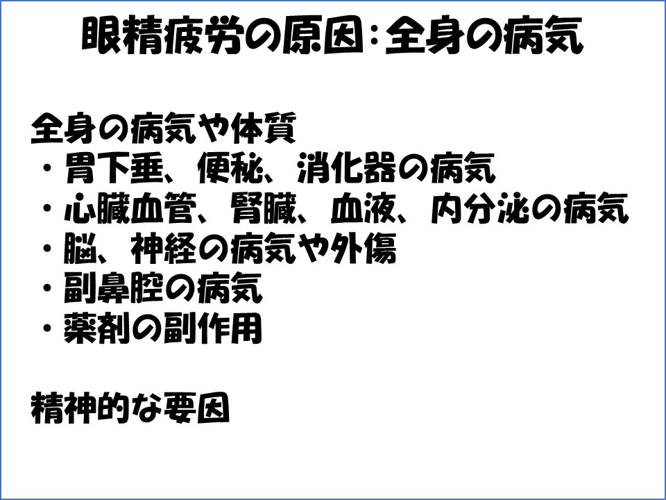 消化器、心臓血管、腎臓、血液、内分泌(ホルモン)、神経などの病気は、全身の体調不良をおこし、その結果目にも眼精疲労のような症状をおこすことがあります。
