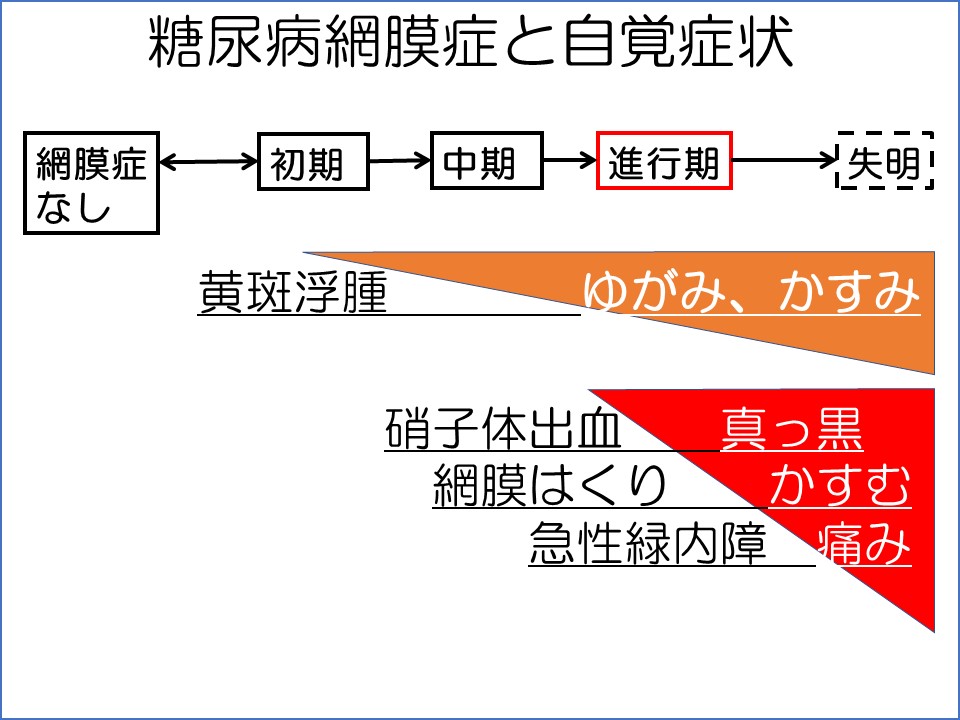 糖尿病網膜症が進行する際に、視力に影響が出てくるのは、初期からおこる糖尿病黄斑浮腫とかなり進行してからしかおこらない硝子体出血、網膜はくり、急性緑内障です。