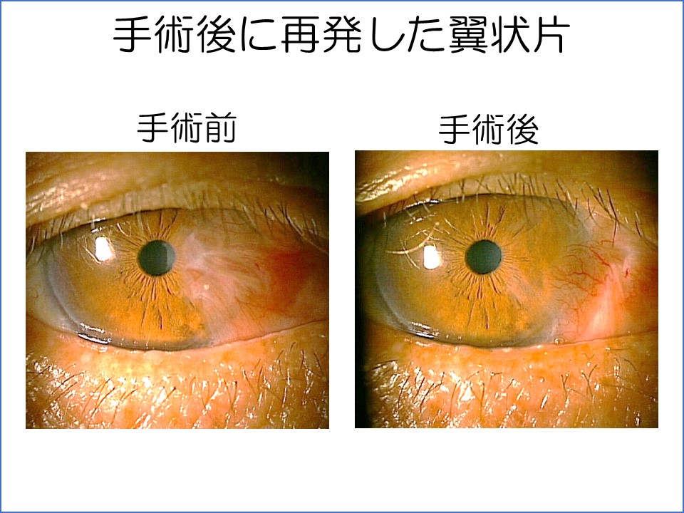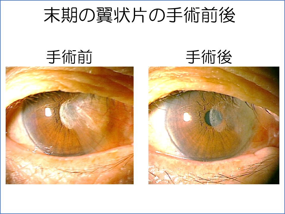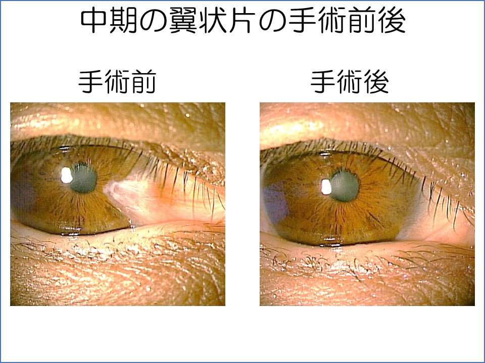 まずもっとも適切な時期に手術をした患者さんの手術前後の写真をご覧ください。不正乱視が出てくる中期の段階で、翼状片はかなり角膜に入ってきていますが、瞳孔(虹彩のしぼりの中の黒い部分)にはまだ入ってない状態です。手術後充血はほとんどなくなっていますが、人により充血が残ることもあります。不正乱視もほぼなくなりました。
