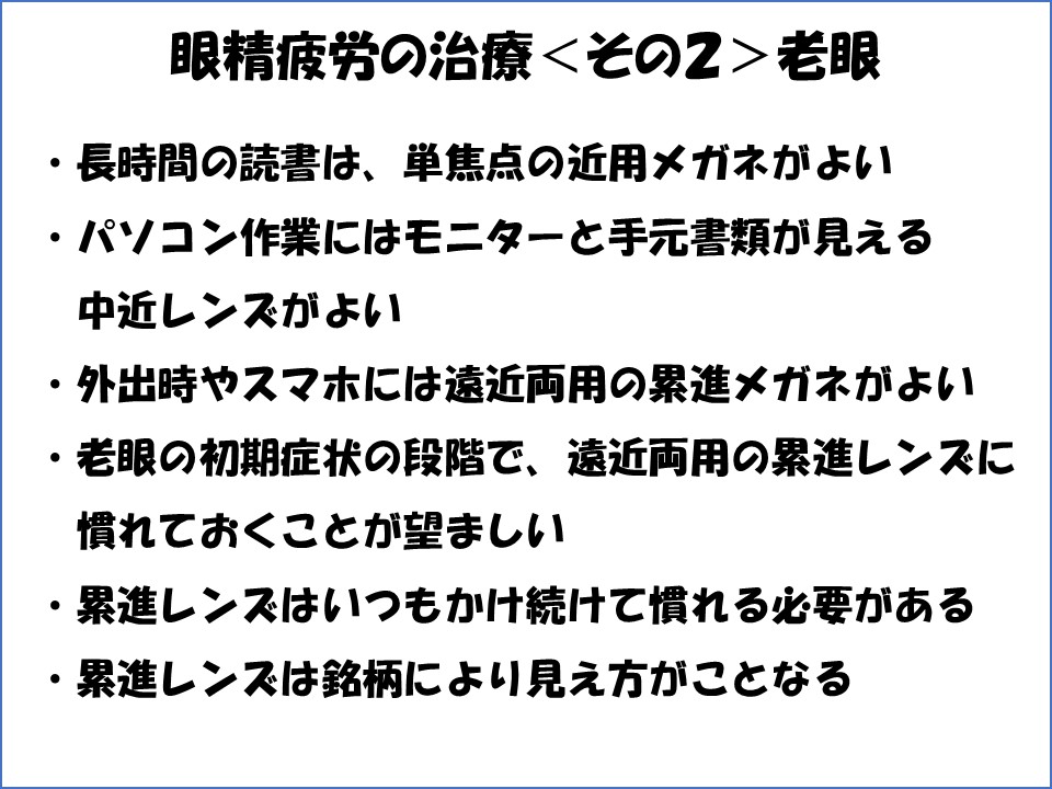 眼精疲労( 疲れ目、目の奥の痛み、頭痛、首のこり、肩こり )の原因に老眼もあります。老眼は、当ブログ「目がいい人と悪い人の違いは?<その2>」でお伝えした通り、40歳くらいからはじまります。言葉が悪いためか、説明する時に切り出しにくいこともあります。