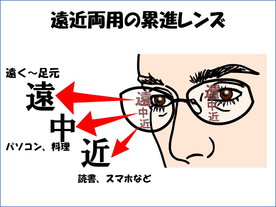 老眼になると、見るもののキョリにより、遠くや、中間、手元のそれぞれに違う度数のメガネが必要になります。そのため、1本のメガネですべて見ようとすると、遠近両用の累進(徐々にピントがかわる)レンズを使うことになります。