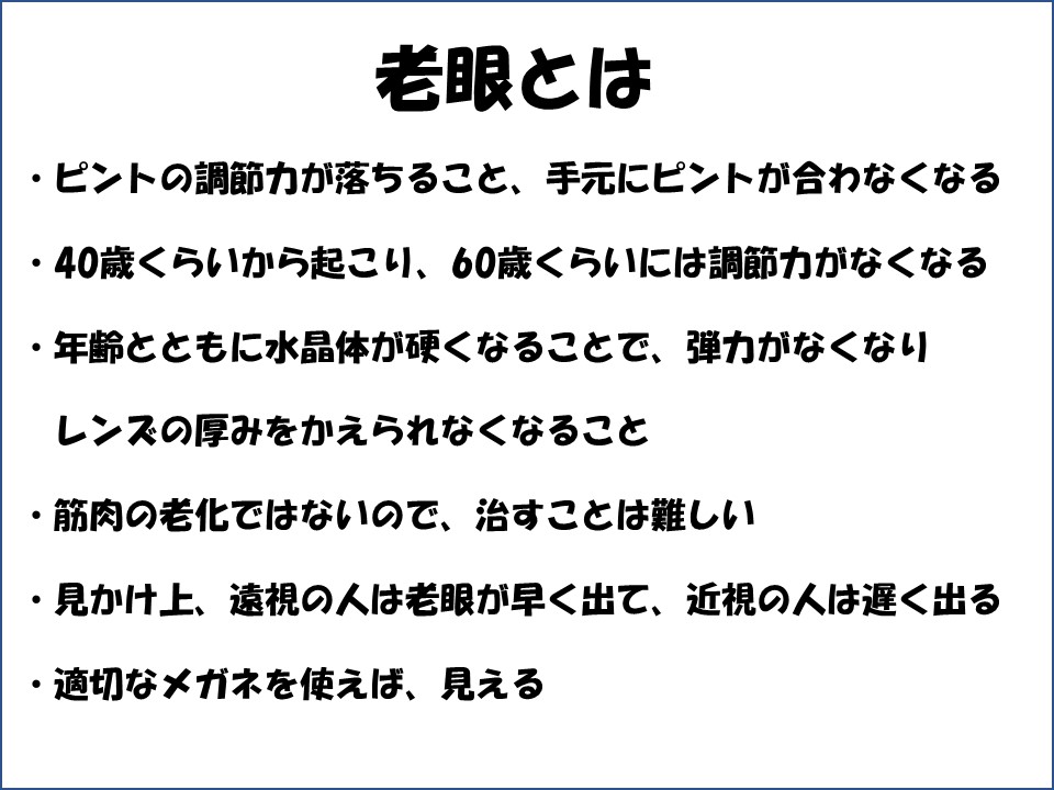 目の病気以外で視力が低下するもう一つの原因として、前回のブログのピント調節がかかった状態のままになってしまう(ピントフリーズ)ことで遠くの見え方が悪くなるのとは逆に、ピント調節が弱くなってしまうことにより主に近くの見え方が悪くなる場合があります。代表的なものに老眼があります。