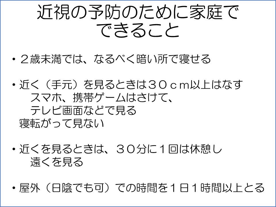 次に屋外活動です。研究によると、屋外活動を長くすると近視になりにくいといわれています。特に小学校入学前までの子供さんに効果があるとのことですので、公園などで遊ぶことは大事です。小学生以上では、今の時代は学校帰りに外で遊ぶことは少ないので難しそうですが、学校の昼休みには外で遊ぶことをおすすめします。日陰でも問題ないようですので、直射日光を気にされる場合でもできると思います。中国などでは教室自体がサンルームのように太陽光が当たるように設計された校舎もあるようです。
