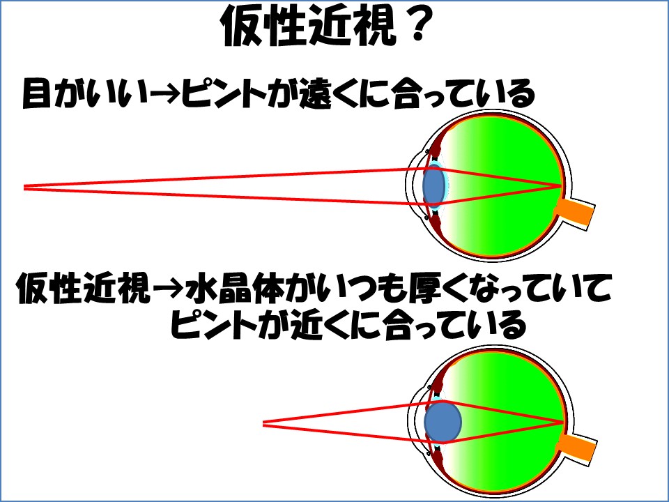 ピント調節のはたらきに異常が起こり、常にピント調節がかかった状態(最近の言葉ではピントフリーズ)のままになってしまうことがある、これが仮性近視、偽近視、調節緊張などと呼ばれ、治療により改善できると言われています。目の中の筋肉をゆるめる目薬で治療できるということです。しかしながら、眼科医の常識として、そのような例は少ないだろうと30年以上前から考えられています。研究データにも古いものしかありません。