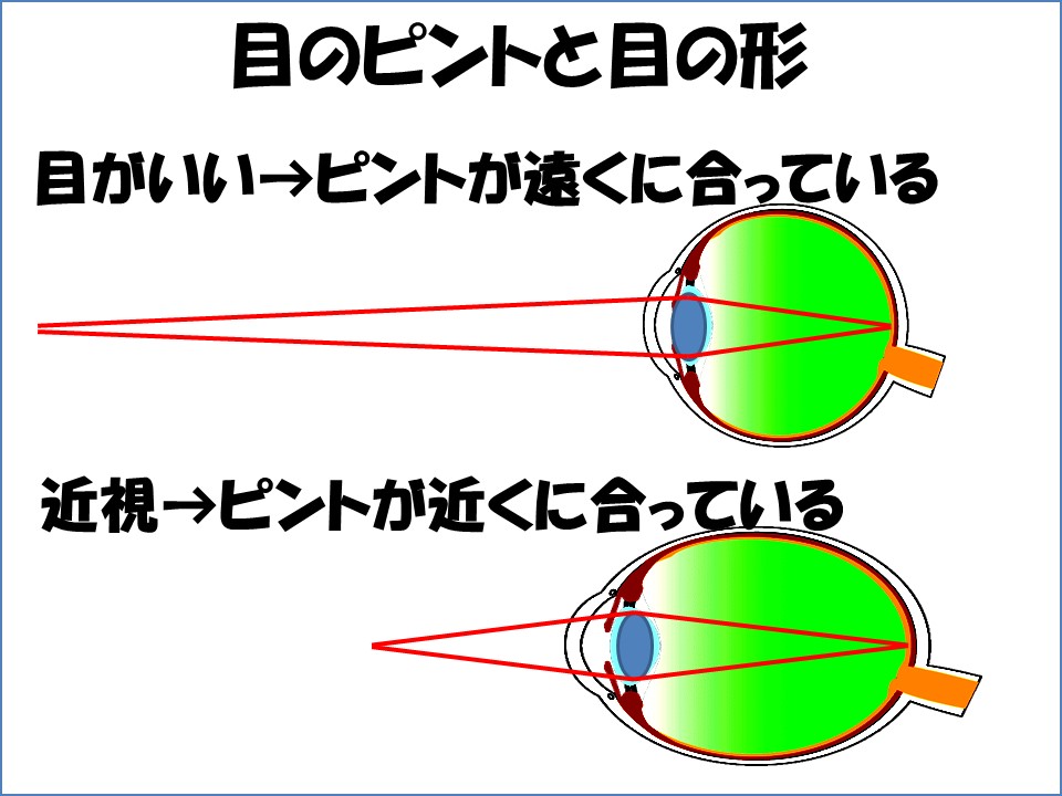 以前当ブログでお伝えしたように、俗にいう目が良い人(正視、軽い遠視)と、目が悪い人(近視)は、乱視を除いて考えると、ほとんどの場合目の奥行きの長さが違うということで、簡単には治せないものということでした。ただ、ちまたには、近視が治るといった話もあり、実際はどういうことなのかを説明します。できれば、ブログ「目がいい人と悪い人の違いは?その1、その2」をご覧ください。
