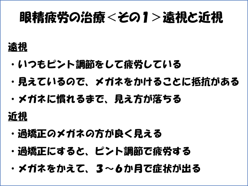 二つ目は、近視です。近視の方は、見えないことにコンプレックスがあるので、遠くが最大限に見えるメガネを希望されます。過矯正のメガネは非常にシャープに見えるので、そのように処方してしまいがちです。その結果遠視の方と同じようにピント調節が疲労し、眼精疲労になります。しかも、合わないメガネが原因で眼精疲労を発症するには、3~6か月の時間がかかるので、メガネの作り替えが原因と考えない方が多く、脳外科などを受診される患者さんもおられます。どうしても過矯正にしたい場合は、遠近両用レンズにして、手元を見る時の負担をへらすこともあります。