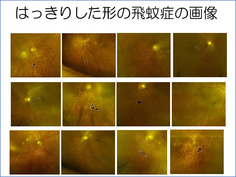 まず検査ではっきりわかる飛蚊症の形を実際の画像でお見せします。近年,散瞳(瞳を開く目薬をする)をしなくても網膜の大部分が見えるレーザー式の眼底カメラが発売され、当院でも使用しています。その眼底カメラを使うとはっきりした形の飛蚊症は画像としてみることができます。少し画像処理をして飛蚊症の形を分かりやすくしていますが、黒くうつった部分が実際の飛蚊症です。丸いものやひも状のものが多く、形は決まっていません。網膜に近いものほどはっきりした形に見えます。