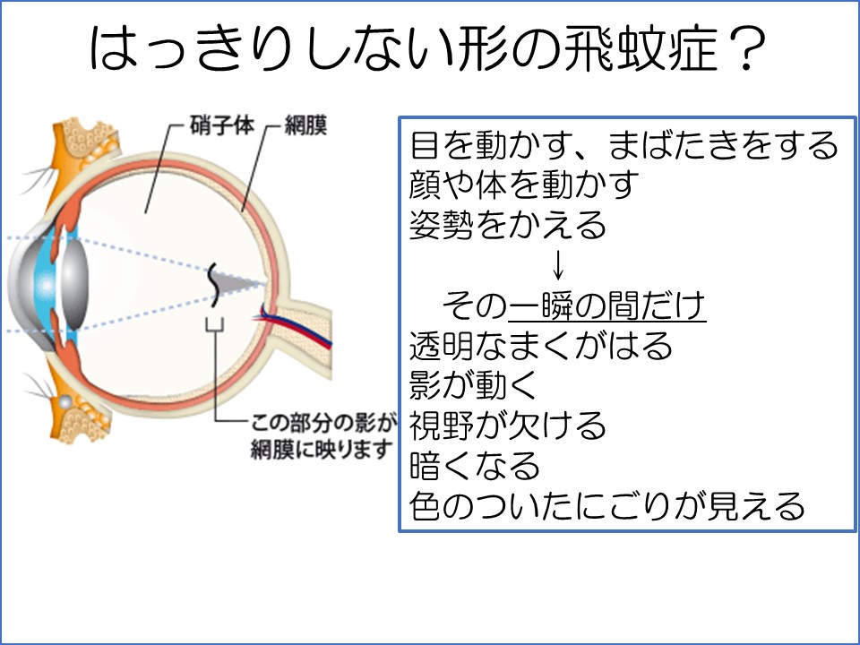 次に検査でもはっきりしない飛蚊症について説明します。飛蚊症の中でも、にごりが薄く、範囲が広く、はっきりしない形のものは、残念ながら眼底カメラでもうつらず、私たち眼科医が検査してもはっきり見えません。そういった場合は患者さんが言われる症状が飛蚊症の一種なのかどうかはっきりせず、原因がわからないということになり、長年悩まれるということもあります。患者さんの訴えとしては、透明なまくがかかる、影が動く、色がついたものが見える、一瞬視野が欠ける、一瞬暗くなるなど様々なものがあり、詳しく問診しなければ重大な目の病気を疑ってしまうような症状もあります。見分け方はやはり、目を動かす、まばたきする(まばたきすると多くの人は一瞬目が上に向く)、顔を動かす、体を動かす、姿勢を変えるといった、目自体と目の中のゼリー(硝子体)の位置関係が一時的に変わるときに症状が出るということです。