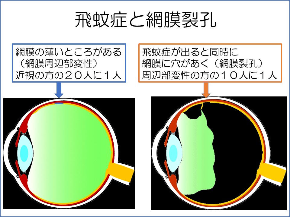 その網膜の薄いところはコラーゲンの膜との癒着が強いため、加齢などによりコラーゲンの膜がはがれるとき(飛蚊症が出るとき、後部硝子体はくり)に、網膜自体に裂け目(網膜裂孔)を作ることがあります。この裂け目は網膜の薄いところがある方の10人に1人くらいに起こすと言われています。この裂け目ができた時に、同時に網膜はくりをおこしている場合もまれにありますが、網膜の裂け目だけで網膜はくりになっていない場合が多いです。この状態は、散瞳(瞳を開く目薬)してから、眼底検査(網膜を顕微鏡などで見る)で発見することができます。その段階で網膜をはがれないように癒着させるレーザー治療(外来ですぐにできる)をすれば、多くの場合網膜はくりへの進行を防ぐことができます。これが、飛蚊症が出たら念のために検査した方がいいという理由です。