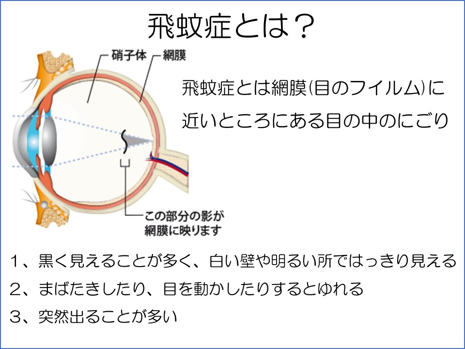 ですので、急に飛蚊症が見えはじめた場合は、念のために眼科を受診した方がよいと思われます。