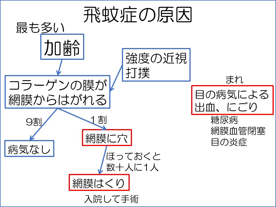 原因は多い順に、加齢による変化、強度の近視、目の打撲、先天性、目の中の出血(硝子体出血)です。