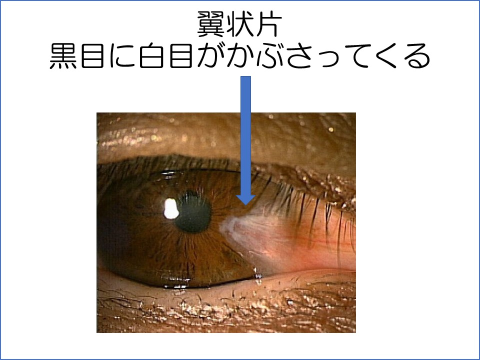 黒目に白目がかぶさってくる病気にもいろいろありますが、今回最も多い「翼状片」について説明します。翼状片とは、主に目頭側(鼻側)の黒目の縁から、白目(結膜)が黒目の中に入ってくる病気です。紫外線が原因と言われていて、以前ブログで取り上げた「瞼裂斑」と関係があると言われています。普通は加齢とともに増えていき、特に海や雪山などの紫外線が特に強い屋外で、長時間過ごすとなりやすいと言われています。普通は40代以降に起こることが多いですが、非常に長時間屋外で過ごすスポーツ少年の中には10代でも見かけることがあります。黒目の異常とともに、白目が充血するので、充血が気になって受診される方もおられます。年単位で非常にゆっくり進行しますので、年に1,2回くらいの間隔で受診されている方が多いです。