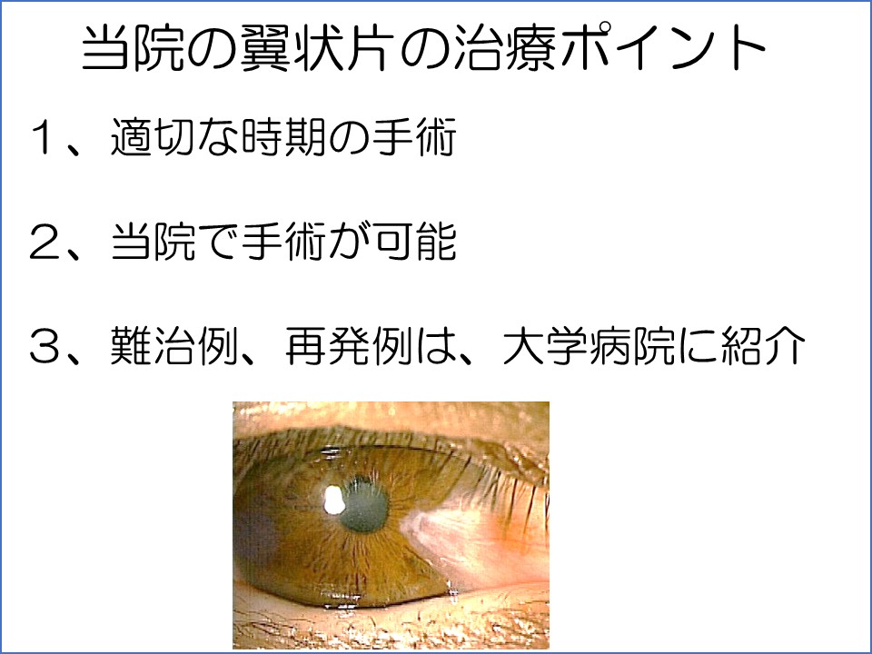 手術による再発の可能性が高い場合や、手術後に再発した場合は、再発率が高くなるので、大学病院などに紹介し、特殊な手術(羊膜移植など)をお願いすることにしております。